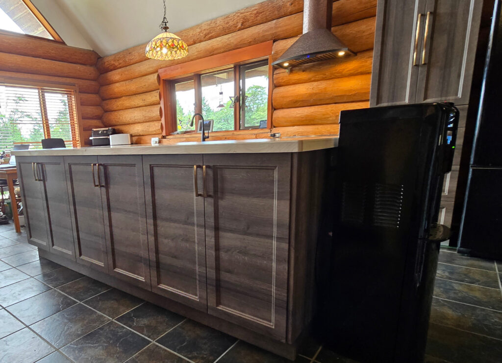 Custom scribed panels and countertops fit seamlessly to each log.